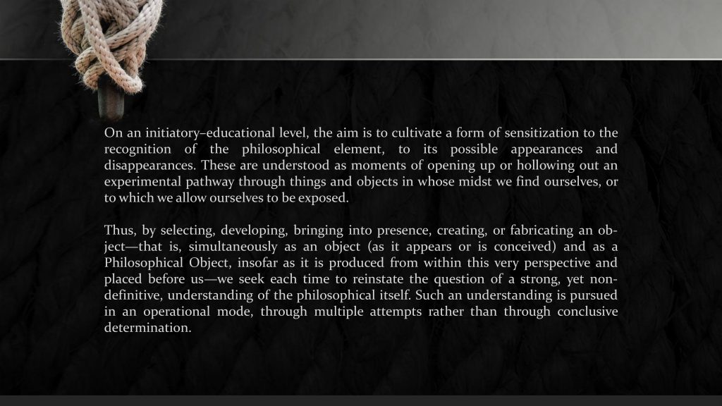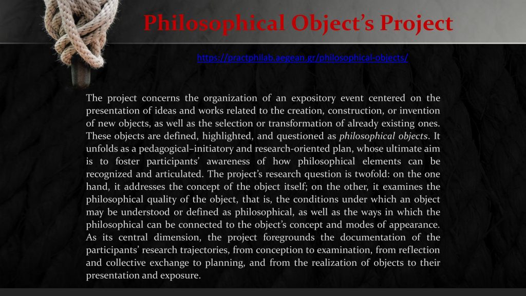 The project refers to the organization of an expository event by the students, which will consist of the presentation of their ideas/works regarding the creation/construction/invention of new objects or the selection or the transformation of already existing objects, which will be defined/highlighted/questioned as “philosophical objects”.